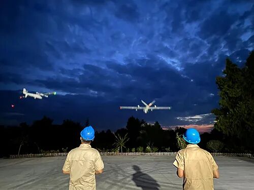 8月28日晚8点,在重庆彭水县连湖镇,随着国网空间技术公司重庆保电机组负责人陈冬的一声令下,两架无人机腾空而起,飞往±800千伏建苏线通道上空开展防山火航巡作业。当天,国网空间技术公司1架直升机和16架无人机组在重庆武隆、铜梁、北碚、荣昌等8个区县,同步开展重要输电线路通道防山火航巡作业。