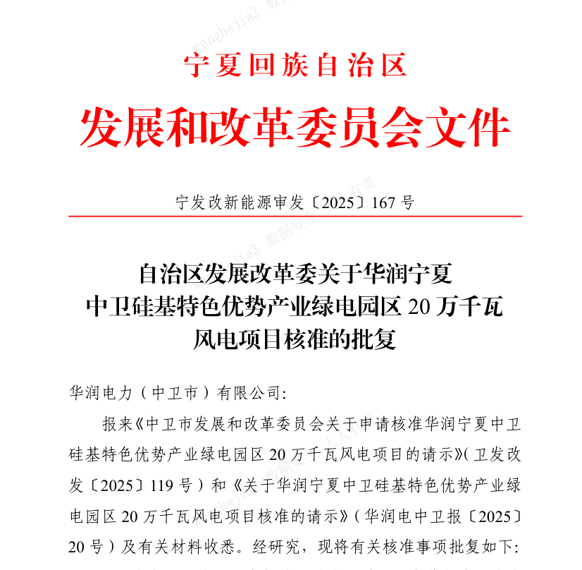 2025年9月24日,华润电力宁夏公司顺利取得华润宁夏中卫硅基特色优势产业绿电园区20万千瓦风电项目核准批复。