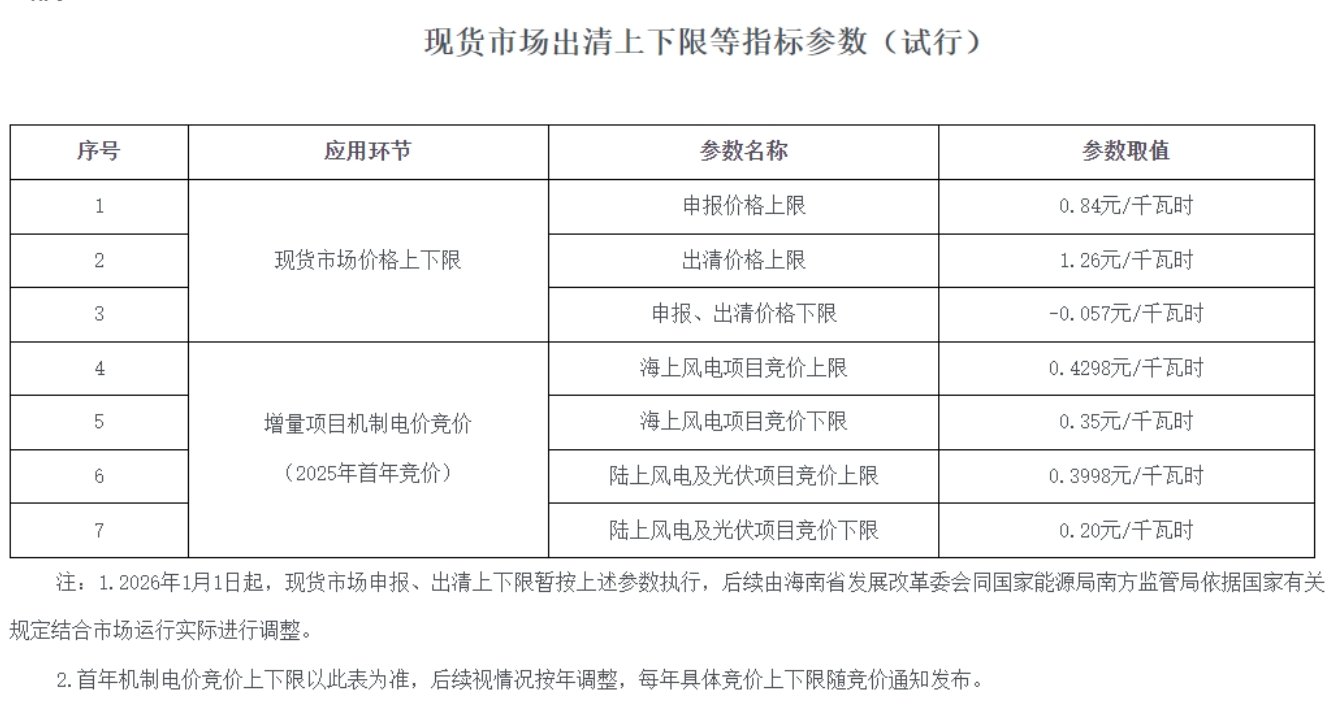 9月26日,海南省发展和改革委员会发布关于印发《海南省深化新能源上网电价市场化改革实施方案》的通知,文件提到,2026年1月1日起,全省新能源(所有风电、太阳能发电,下同)项目上网电量全部进入电力市场,上网电价通过市场交易形成。新能源项目参与市场交易的方式按照南方区域电力市场交易规则执行,鼓励具备条件的分布式、分散式新能源聚合后报量报价参与市场交易,未报量报价参与市场的默认接受市场形成的价格。后续根据市场建设情况,逐步放开各类电源进入市场参与交易。