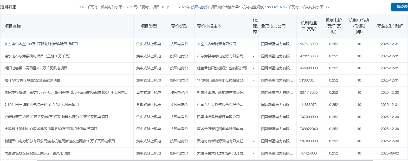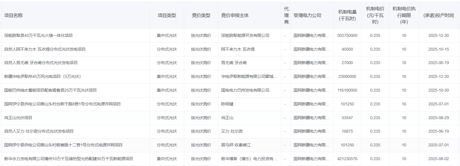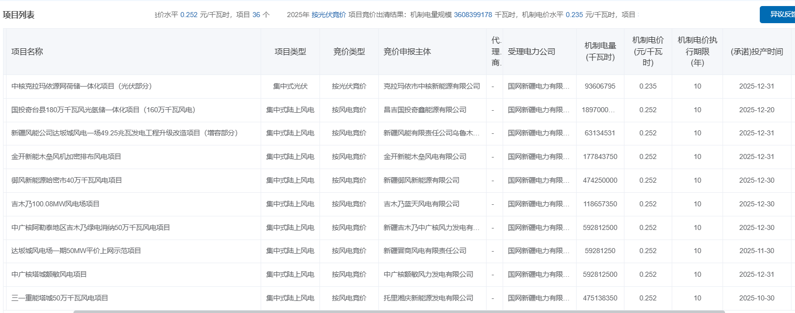 10月15日,国网新疆电力有限公司公示2025年度增量新能源项目机制电价竞价结果。