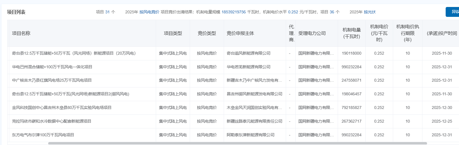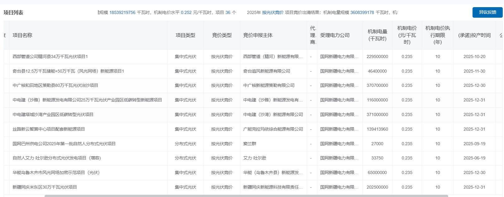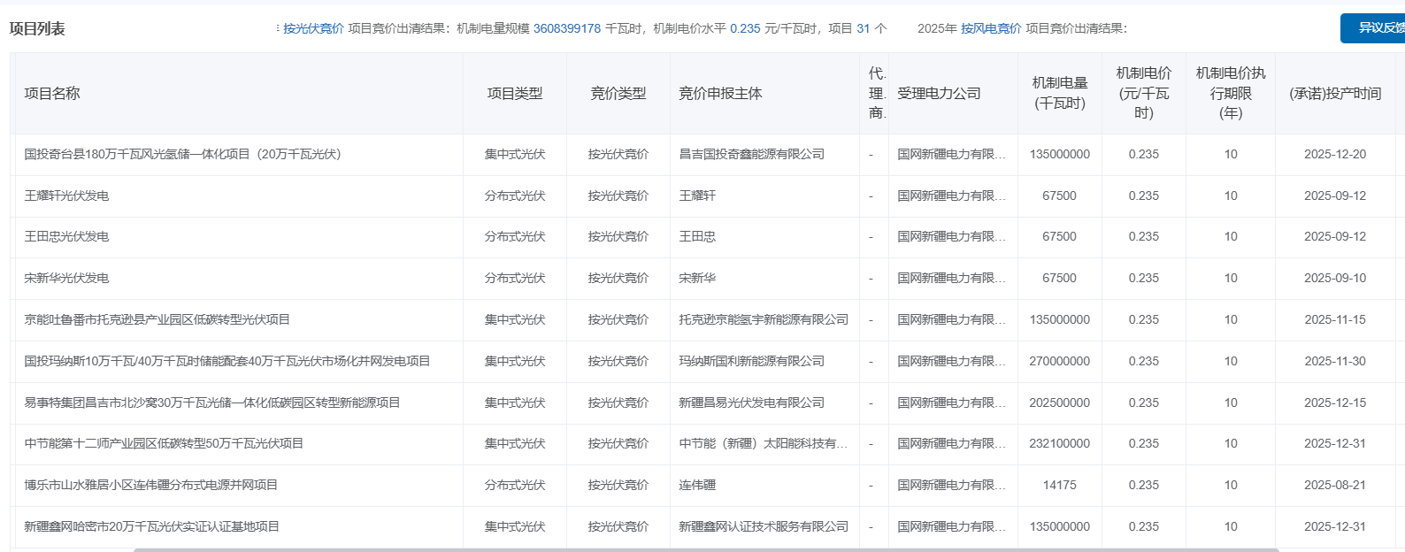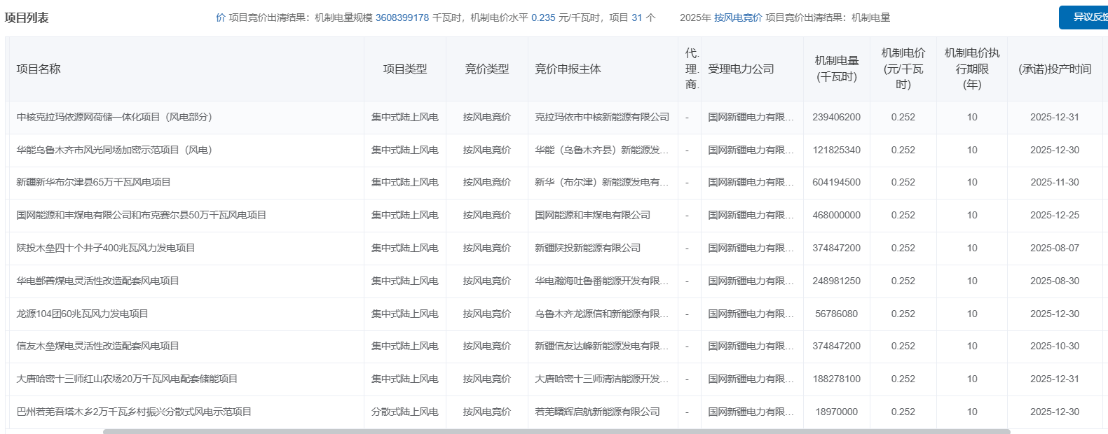 10月15日,国网新疆电力有限公司公示2025年度增量新能源项目机制电价竞价结果。