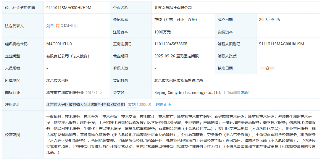 据了解,辛集市辛氢科技有限公司成立于2025年4月。