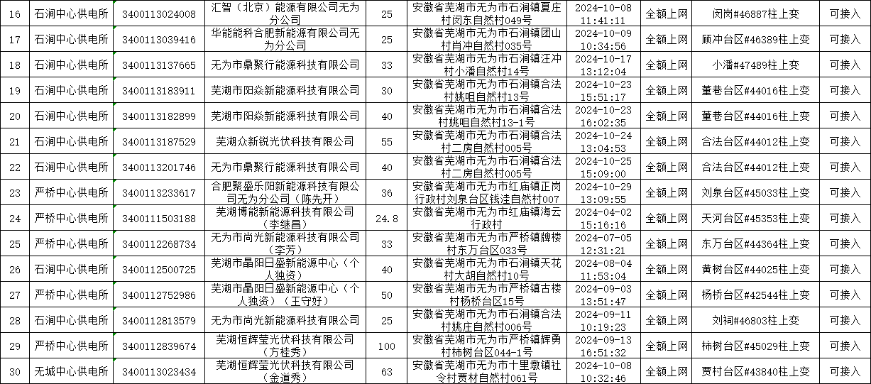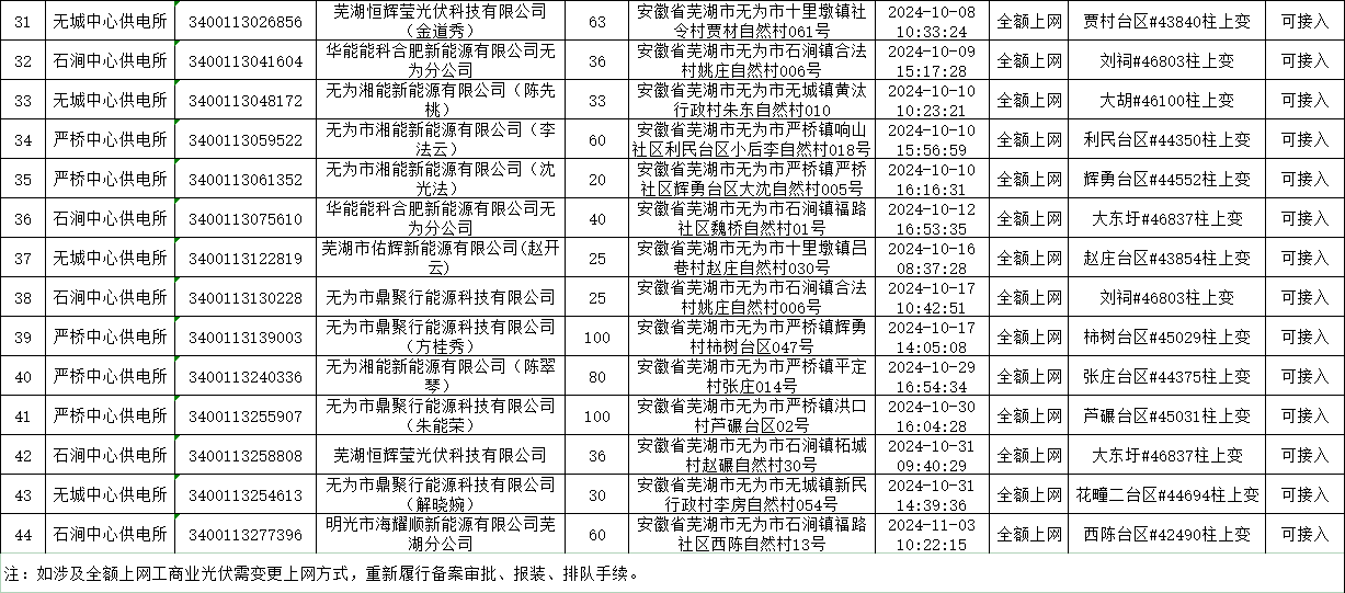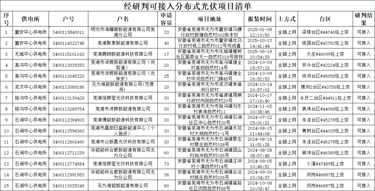 2025年9月25日,我委已公示“关于集中核查清理无为地区在途超一年光伏项目的公告”,现针对无为地区在途超一年未办理延期手续的光伏项目进行容量释放,经与国网无为市供电公司研究会商,根据容量改善线路台区暂缓接入排队用户报装先后时序,拟对以下分布式光伏项目予以并网。请涉及光伏合作开发企业或自然人7天内至国网无为市供电公司各镇供电所营业厅按规定办理,逾期未办理视为放弃接入资格。