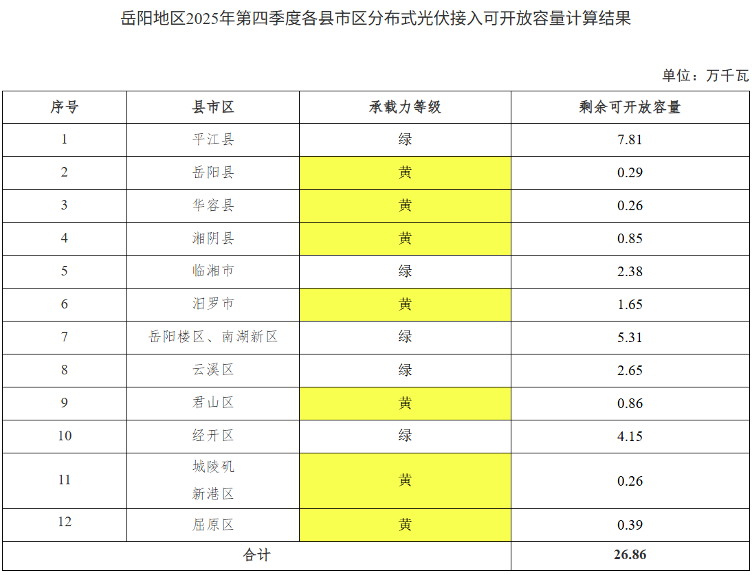 依据国家能源局电力行业标准《分布式电源接入电网承载力评估导则》(DL/T2041—2019)及《湖南省发展和改革委员会关于做好分布式光伏可开放容量管理有关事项的通知》(湘发改能源〔2024〕509号)相关要求,湖南省电力有限公司组织对各市州经营区范围内的2025年四季度各县市区分布式光伏接入可开放容量进行测算,岳阳地区计算结果公布如下: