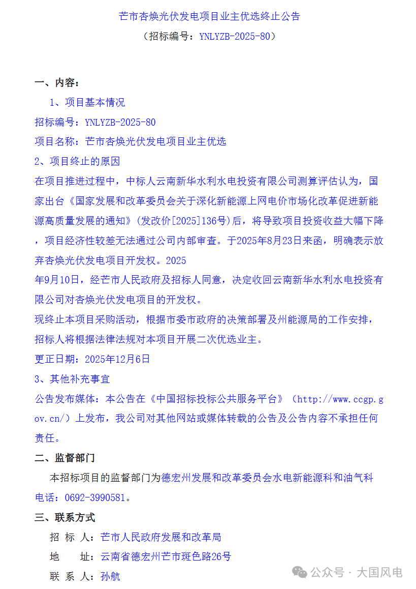根据公告,项目公司认为:136号实施后,将导致项目投资收益大幅下降项目经济性较差无法通过公司内部审查,于2025年8月23日来函,明确表示放弃杏焕光伏发电项目开发权。