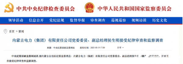 中央纪委国家监委网站讯,据内蒙古自治区纪委监委消息:内蒙古电力(集团)有限责任公司党委委员、副总经理侯生明涉嫌严重违纪违法,目前正在接受纪律审查和监察调查。