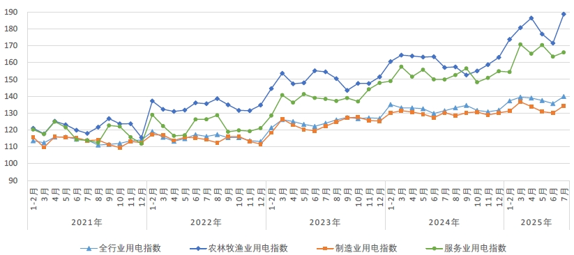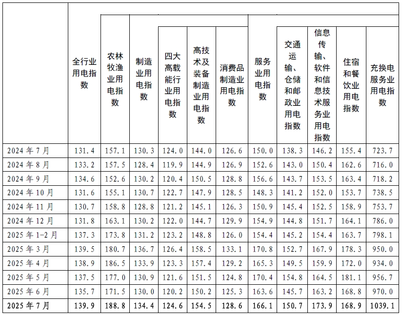 2025年7月,全国全行业用电指数为139.9,全行业用电量比2020年基期(以2020年基期为100)增长了39.9%,年均增长6.9%,同比增长6.5%,增速比上月提高1.9个百分点。