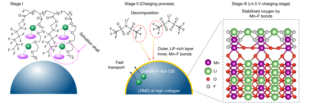 基于锂键化学原理,团队构建了“–F∙∙∙Li⁺∙∙∙O–”配位结构,诱导形成具有高离子电导率的富阴离子溶剂化结构,在电极表面衍生出富含氟化物的稳定界面层,显著提升了界面稳定性。