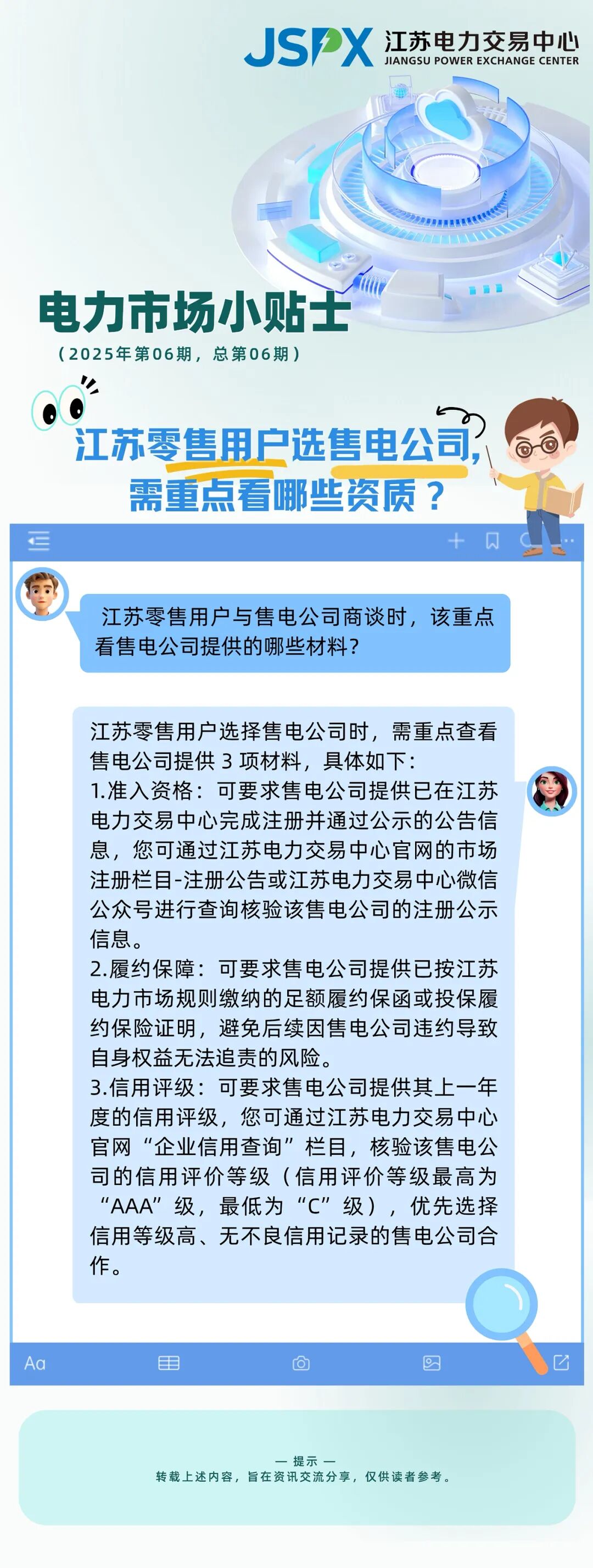 近日,江苏电力交易中心发布电力市场小贴士(2025年第06期,总第06期)——江苏零售用户选售电公司,需重点看哪些资质?