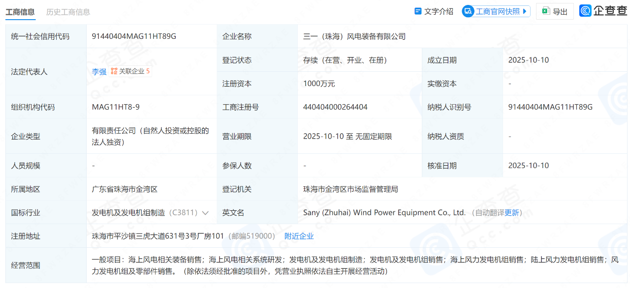 企查查App显示,10月10日,三一(珠海)风电装备有限公司成立,法定代表人为李强,注册资本1000万元,由三一重能全资持股。