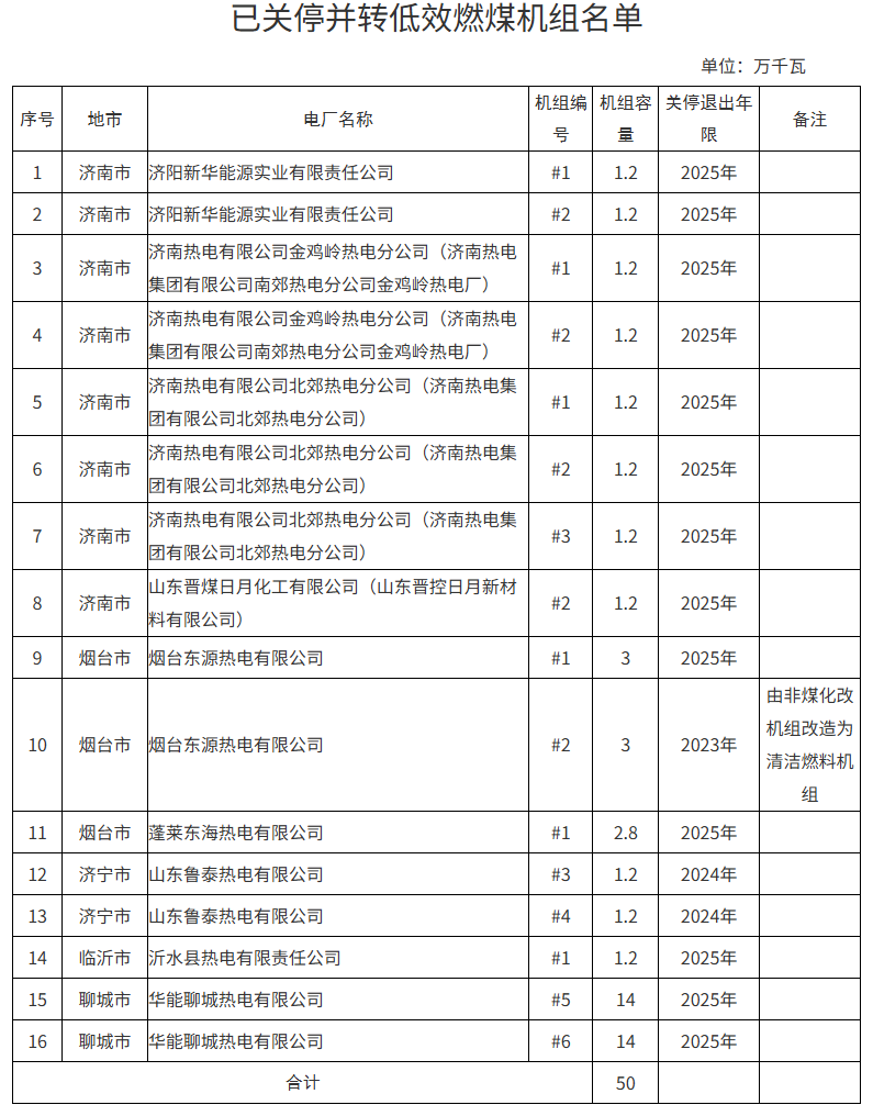 按照我省关于关停淘汰30万千瓦以下低效燃煤机组相关工作要求,现将济南、烟台、济宁、临沂、聊城市已关停并转低效燃煤机组名单进行公示,接受社会各界监督。