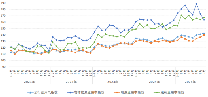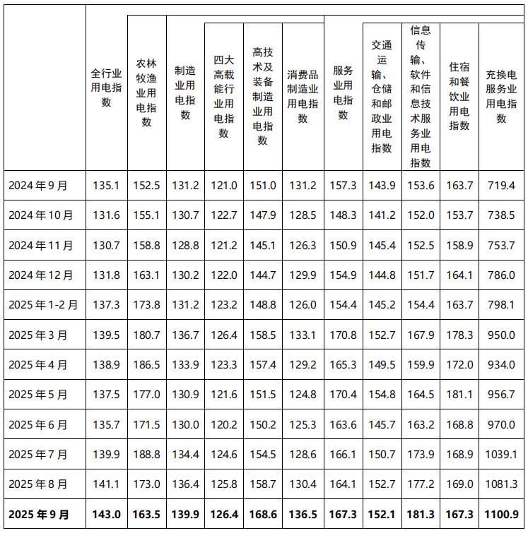 2025年9月,全国全行业用电指数为143.0,全行业用电量比2020年基期(以2020年基期为100)增长了43.0%,年均增长7.4%,同比增长5.8%,增速比上月回升0.2个百分点。