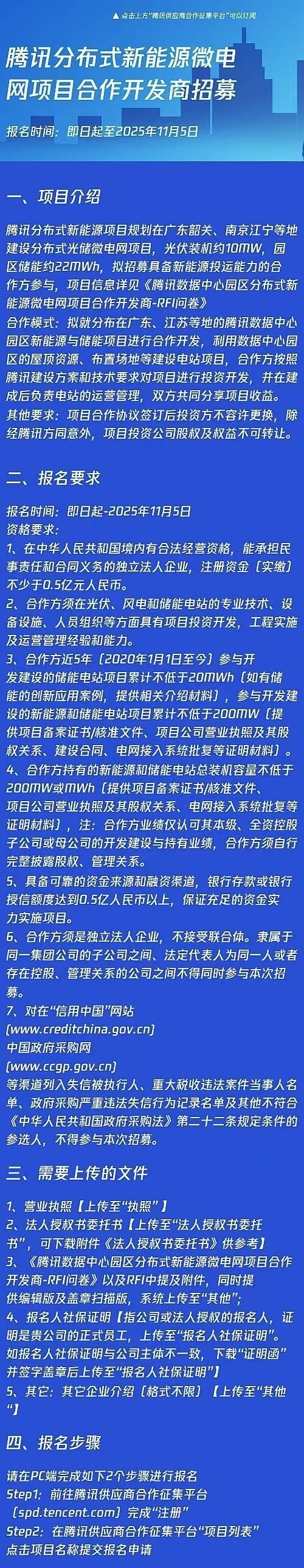 10月22日,腾讯供应商合作征集平台发文“腾讯分布式新能源微电网项目合作开发商招募”。