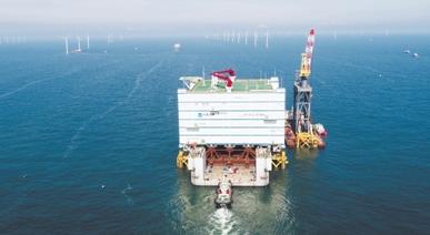 近日,在江苏如东黄沙洋海域,重达2.2万吨的三峡如东柔性直流输电工程海上换流站在驳船的托举下,完成与导管架的毫米级精准对接,标志着世界最大、亚洲首座海上换流站顺利完成安装。