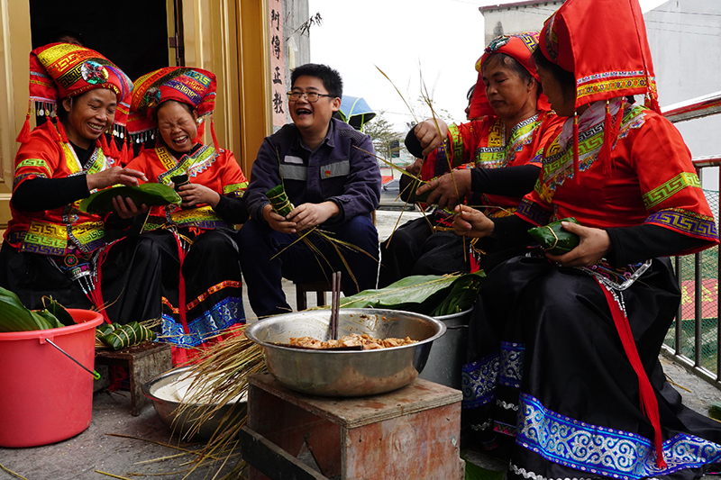 南方电网广西南宁供电局派驻上林云桃村第一书记黄建敏和村民一起包粽子。(敬敏 摄)