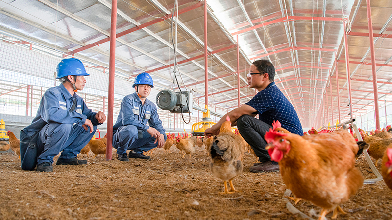 南方电网广西百色田阳供电局五村供电所员工到当地扶贫项目华润养鸡场进行安全用电检查。(陈伯鑫 摄)