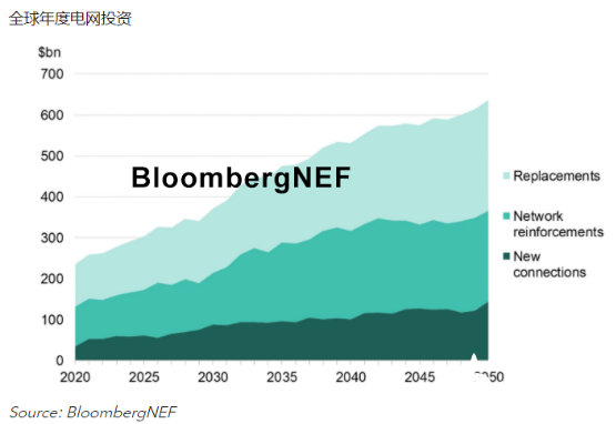 2020年,电网投资约为2350亿美元,到2050年,电网投资需增至6360亿美元,支撑电源建设,满足新增用电需求,并替换现有基础设施。