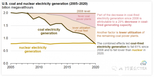 2005年以来煤电的实际快速下降趋势,资料来源:美国能源信息署