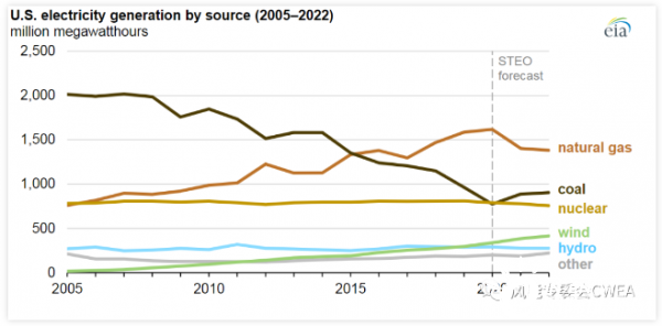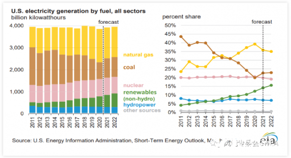 如果将风力发电、太阳能发电和水电合并到一起,可再生能源的发电量也已经超过了煤电。但美国天然气发电仍然处于领先地位。EIA展望报告显示,到2050年,美国可再生能源发电占比将提升到42%,超过天然气发电。