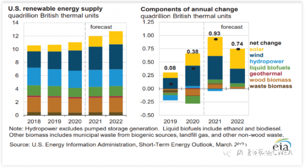 EIA预计,由于总容量为5.1GW的三个核电厂计划在2021年退役,核电的发电量将减少。密歇根州的Palisades核电厂计划在2022年退役,但佐治亚州的Vogtle核电厂计划在2021年11月增加1.1GW的产能,并在2022年11月再增加1.1GW的产能。