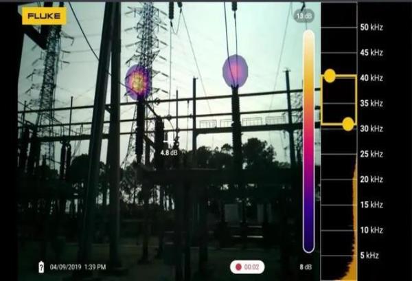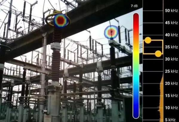 通过触摸屏快速调整声学成像仪的频段,局部放电的频段通常在40kHz左右,所以该声学成像仪的频段设置在35kHz-40kHz(黄色框),既能清晰地反映出局部放电的位置,又可以有效屏蔽现场的噪声干扰。