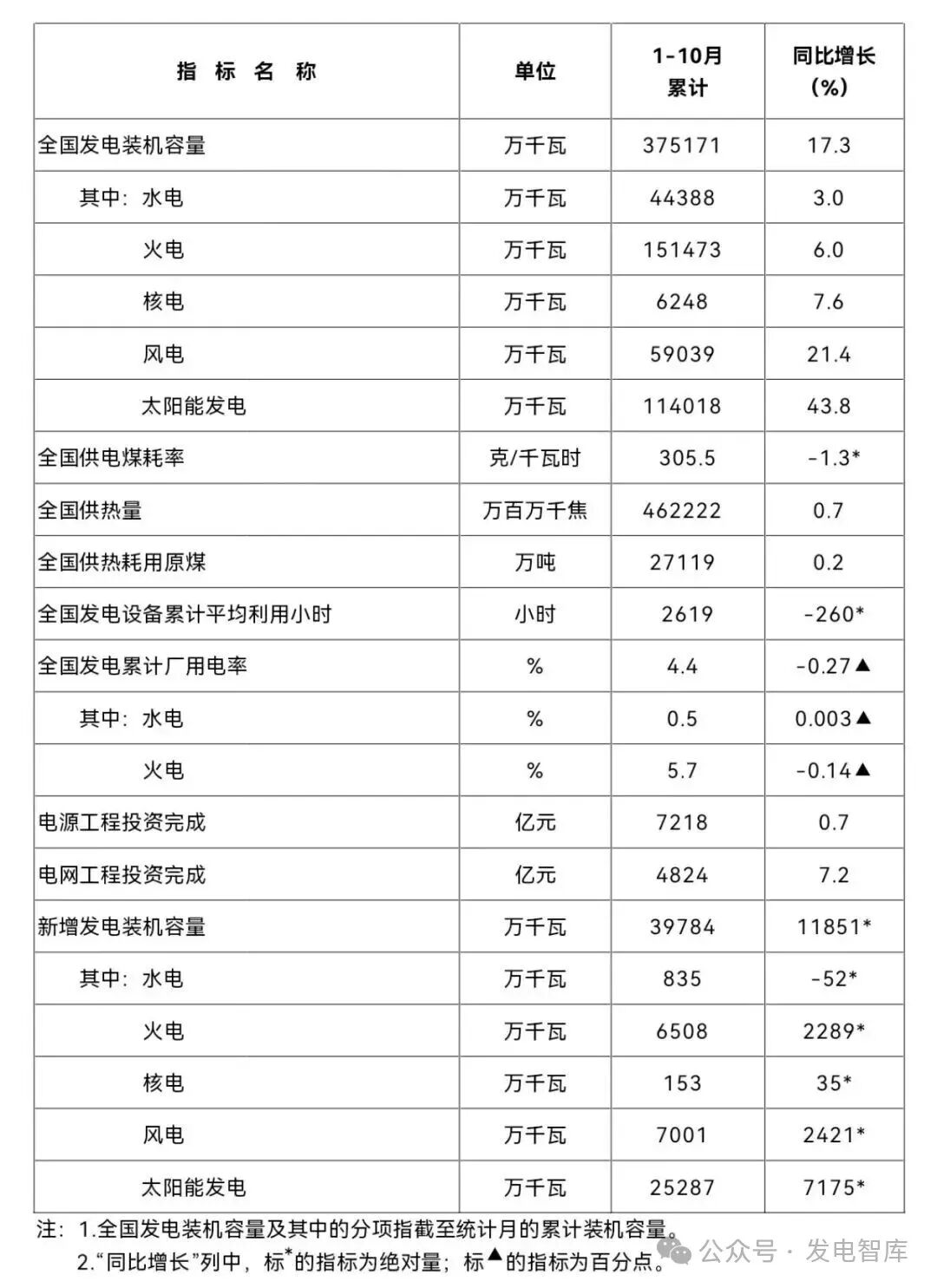 11月24日,国家能源局发布1-10月份全国电力工业统计数据。