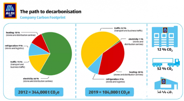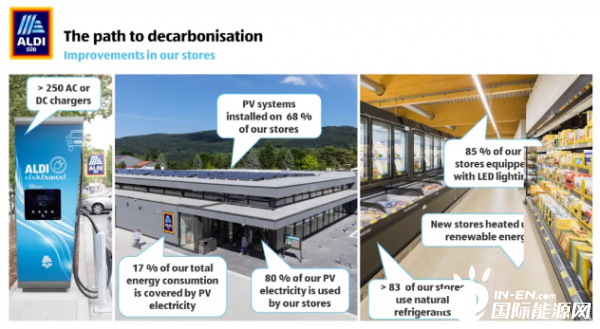 更直接的是一家德国公司,也是德国首富旗下的企业——德国最大的连锁超市ALDI阿迪超市。这家拥有2000家分店的德国企业用最简单的方式实现碳中和:在自己的超市屋顶安装光伏,停车场里安装充电桩,采取虚拟电厂运营自己的储能和冰柜,让物流车被氢能和电动卡车取代。