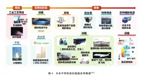如图4所示,日本对不同阶段氢能在不同领 域的应用进行了分析,显示了氢能在当下能源系 统中的重要位置以及未来能源互联网系统中的具体应用前景.目前,日本比较成熟的氢能应用包括石油精炼、光纤制造等工业制造领域和被当作高能燃料使用的航空航天领域;目前处于实用化阶段的应用主要包括燃料电池汽车和家用燃料电池电站;随着氢能相关技术的不断进步, 未来还会进一步被用于业务产业用燃料电池发电、家用或特殊用途的燃料电池、不同类型的燃料电池交通工具(包括业务用车、公共汽车、列车、船、飞机)等 各种备用电源,以及更多的工业应用等。