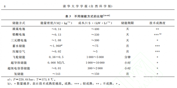 3)电磁储能,包括超导体储能和超级电容 器储能.氢储能的基本原理是电解水产生氢气和氧气,可以将其看作是化学储能的延伸。表3归纳了不同储能方式的能量密度、成 本、储能期限和技术成熟度。对比可知,氢储能相比于其他储能方式有诸多优点.氢储能的能量 密度显著高于其他储能方式,储能期限较长,满 足长时间储能的需求,可实现可再生能源的跨季 储能和跨区域能量传递.此外,电解水制氢可以提高可再生能源利用率,减少化石燃料的使用, 提高能源体系清洁化。氢储能成本低于电化学储能、电磁储能和飞轮储能,尽管略高于发展时间较久的压缩空气储能和蓄水储能,但随着氢气制备和储运技术的进一步发展,市场规模的进一步扩大,成本将会进一步降低.氢储能是前景广阔的可再生能源储能方式,可在能源互联网的构建方面发挥重要作用。