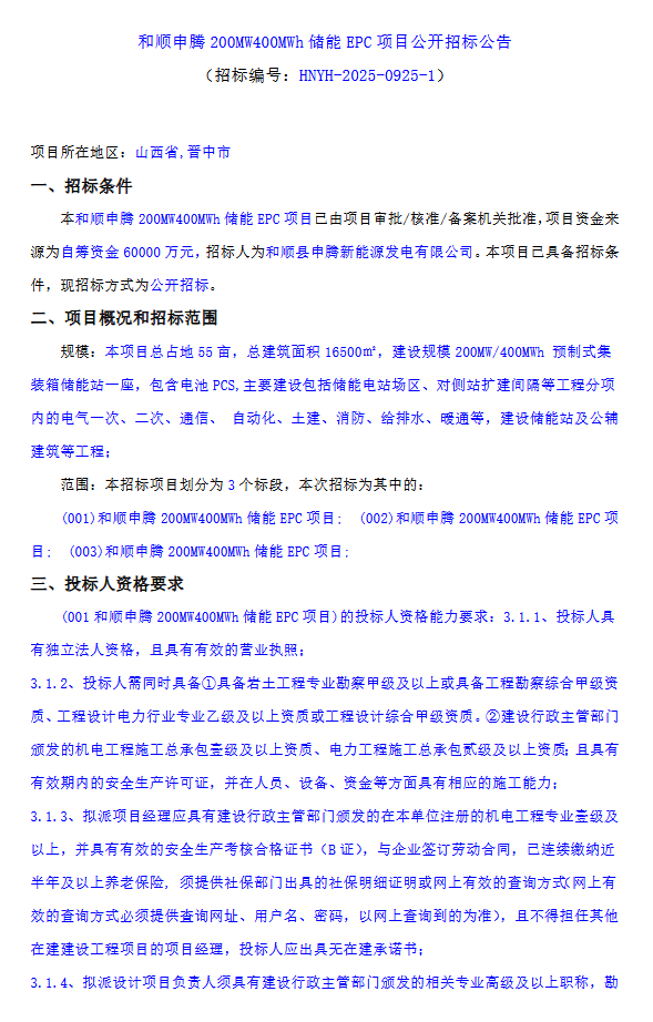 9月25日,和顺县申腾新能源发电有限公司发布和顺申腾200MW/400MWh储能EPC项目公开招标公告。项目位于山西省晋中市,项目资金来源为自筹资金60000万元,折合单价1.5元/Wh。