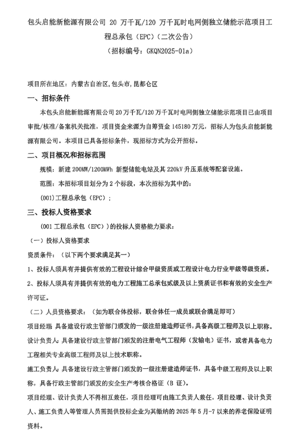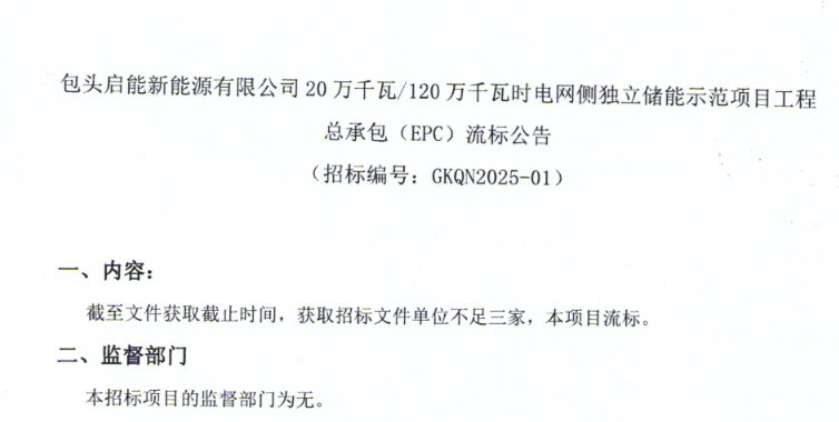 9月25日,包头启能新能源有限公司20万千瓦/120万千瓦时电网侧独立储能示范项目工程总承包(EPC)流标公告发布。截至文件获取截止时间,获取招标文件单位不足三家,本项目流标。