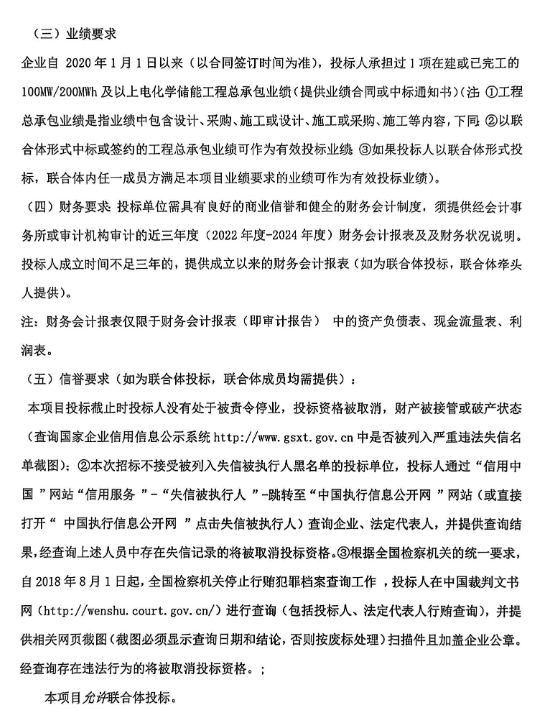 招标要求企业自2020年1月1日以来(以合同签订时间为准),投标人承担过1项在建或已完工的100MW/200MWh及以上电化学储能工程总承包业绩。