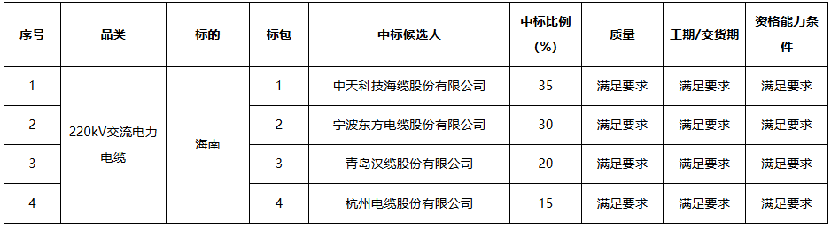 南方电网公司2025年220kV交流电力电缆新增批次框架招标项目中标候选人公示
