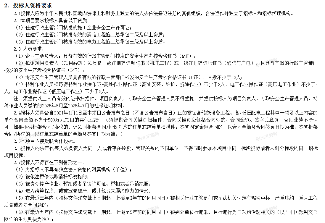 业绩方面,项目要求投标人具备自2021年1月1日至本项目公告发布之日(不含公告发布当日)止的需包含储能设备工程、高/低压配电工程其中一项及以上内容的单个合同金额不少于500万元项目的类似业绩。
