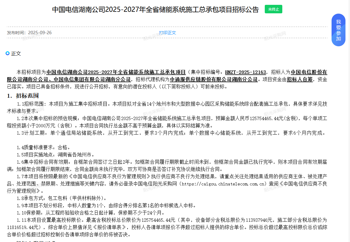 9月26日,中国电信湖南公司2025-2027年全省储能系统施工总承包项目招标公告发布。