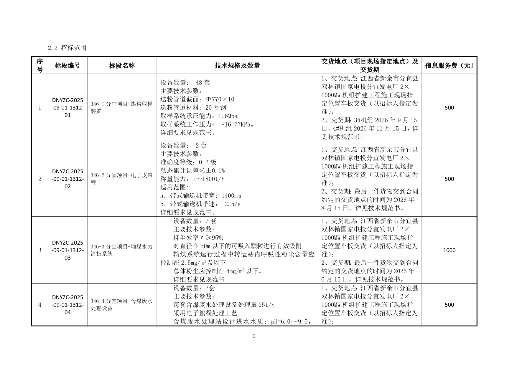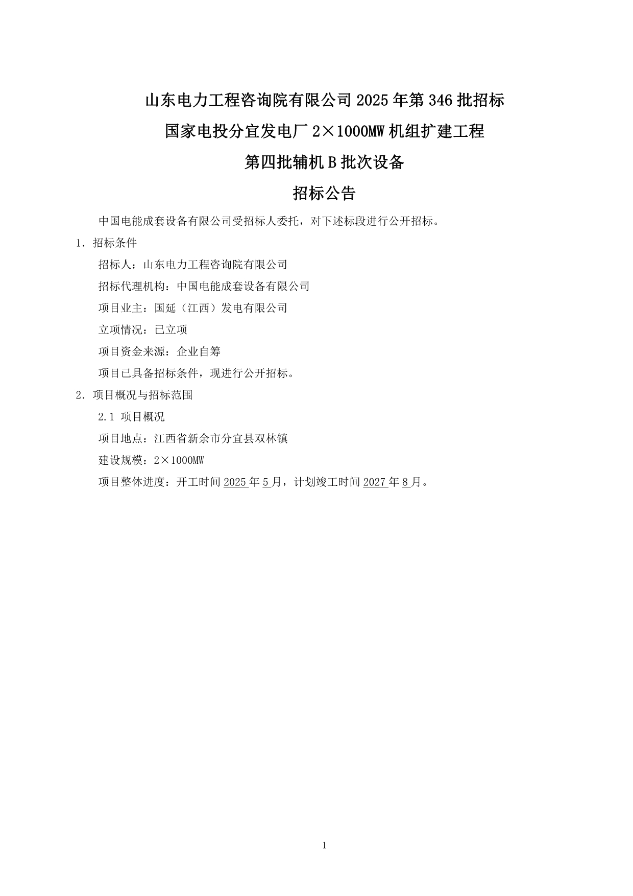 山东电力工程咨询院有限公司2025年第346批招标国家电投分宜发电厂2×1000MW机组扩建工程第四批辅机B批次设备招标公告