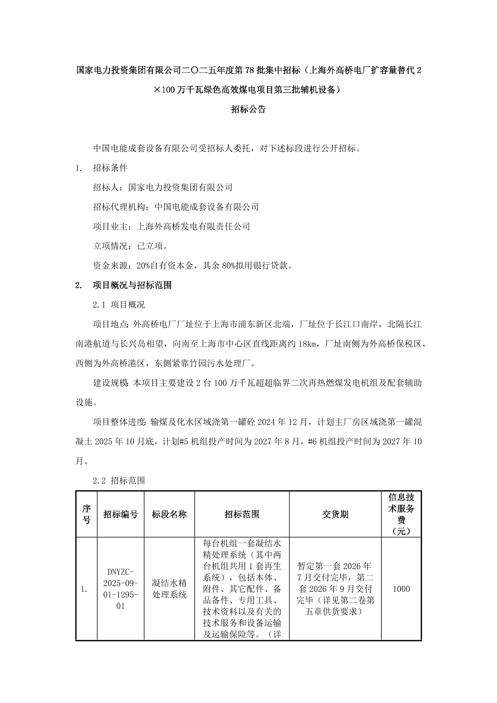 国家电力投资集团有限公司二〇二五年度第78批集中招标(上海外高桥电厂扩容量替代2×100万千瓦绿色高效煤电项目第三批辅机设备)招标公告