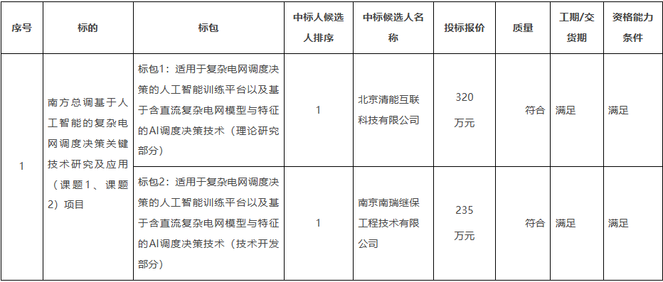 南方总调基于人工智能的复杂电网调度决策关键技术研究及应用(课题1、课题2)项目中标公示