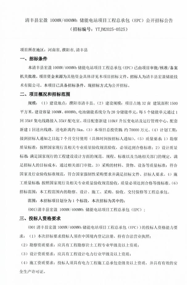 10月24日,清丰县宏盈储能技术有限公司发布清丰县宏盈100MW/400MWh储能电站项目工程总承包(EPC)公开招标公告。