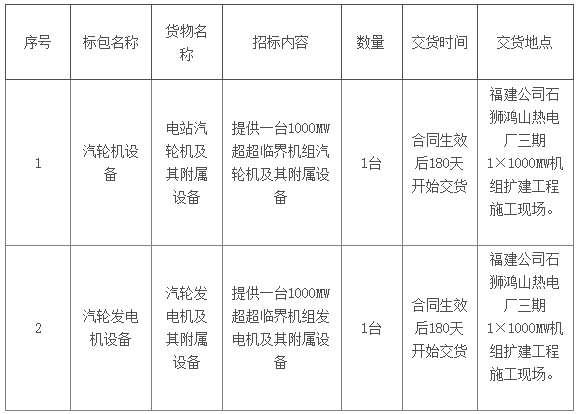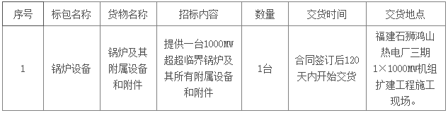 交货地点:福建公司石狮鸿山热电厂三期1×1000MW机组扩建工程施工现场。