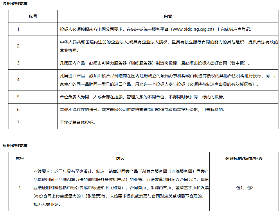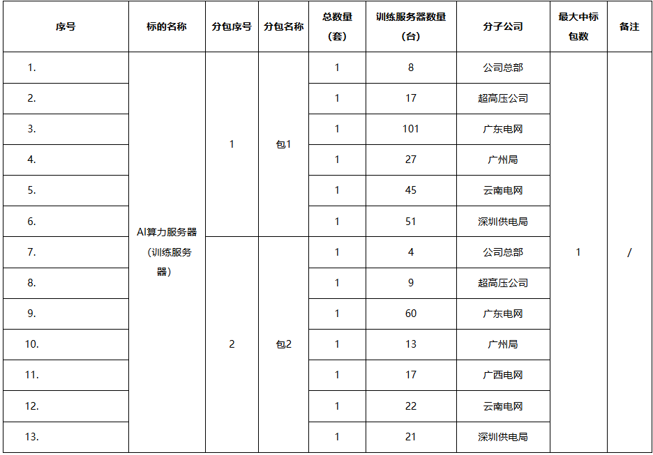 2.1项目概述:按公司2025年集团物资采购工作计划,公司总部,超高压,广东、广西、云南电网公司和深圳供电局等单位申报了AI算力服务器(训练服务器)的有关需求,根据年度采购计划组织开展本批次的招标工作。
