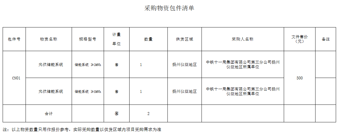 本次采购范围为江苏扬州仪征地区所需光伏储能系统,包括1套≥3MWh和1套≥5MWh规格产品,公告所示采购数量仅作报价参考,实际供应以项目实际需求为准。