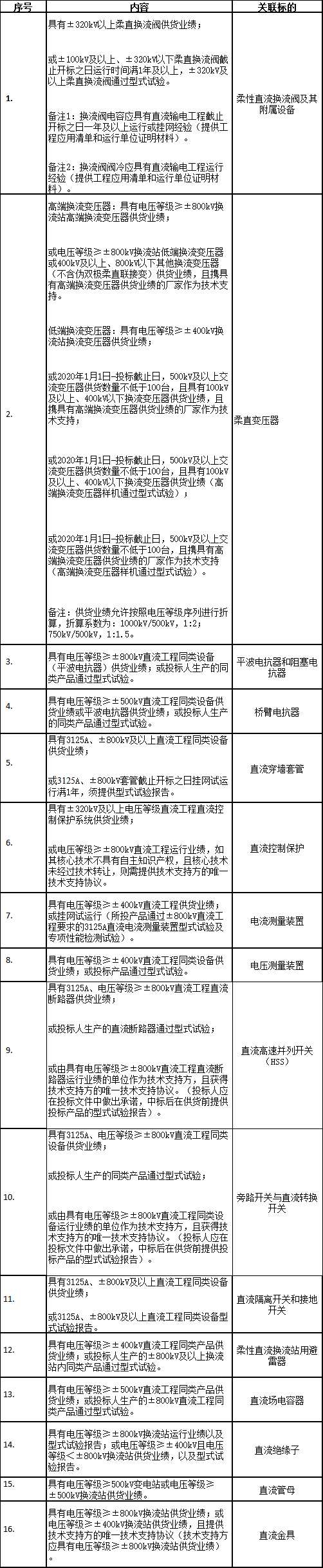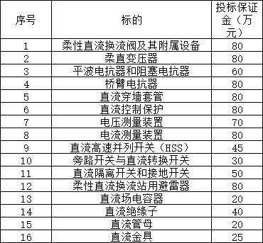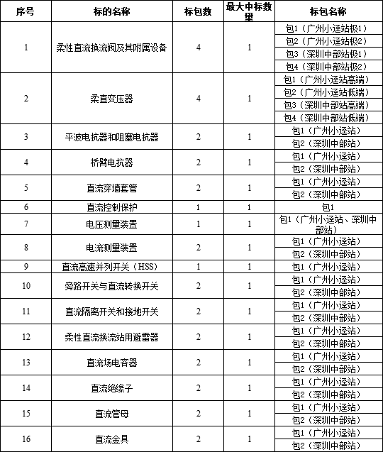 本次招标范围包括柔性直流换流阀及其附属设备、柔直变压器、直流穿墙套管、直流控制保护、电流测量装置、电压测量装置、平波电抗器和阻塞电抗器、桥臂电抗器、柔性直流换流站用避雷器、直流场电容器、旁路开关与直流转换开关、直流高速并列开关(HSS)、直流隔离开关和接地开关、直流绝缘子、直流管母、直流金具共16个标的,需求单位为超高压公司。