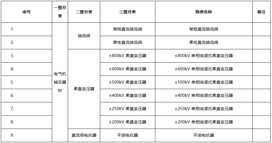 为保障藏东南至粤港澳大湾区±800千伏特高压直流输电工程的进度,现组织开展受端换流站直流主设备和材料采购工作,包括柔性直流换流阀及其附属设备、柔直变压器、直流穿墙套管、直流控制保护、直流测量装置、直流场电抗器、柔性直流换流站用避雷器、直流场电容器、旁路开关与直流转换开关、直流高速并列开关(HSS)、直流隔离开关和接地开关、直流绝缘子、直流管母、直流金具等物资。