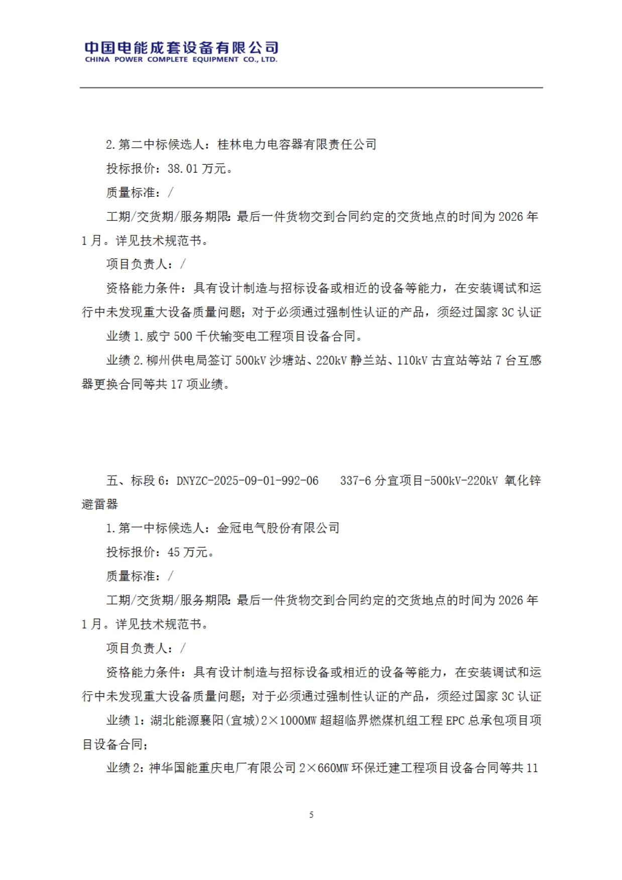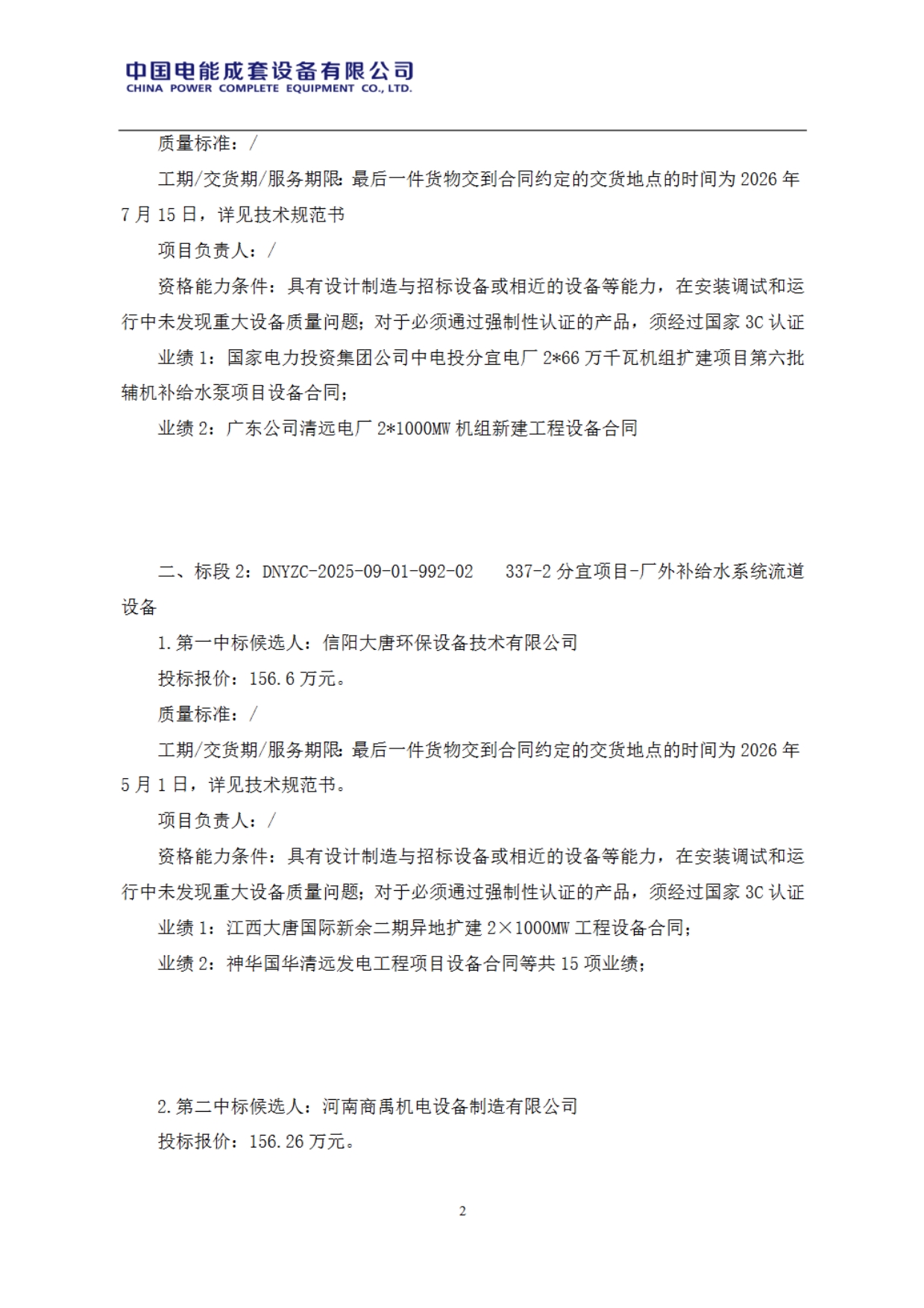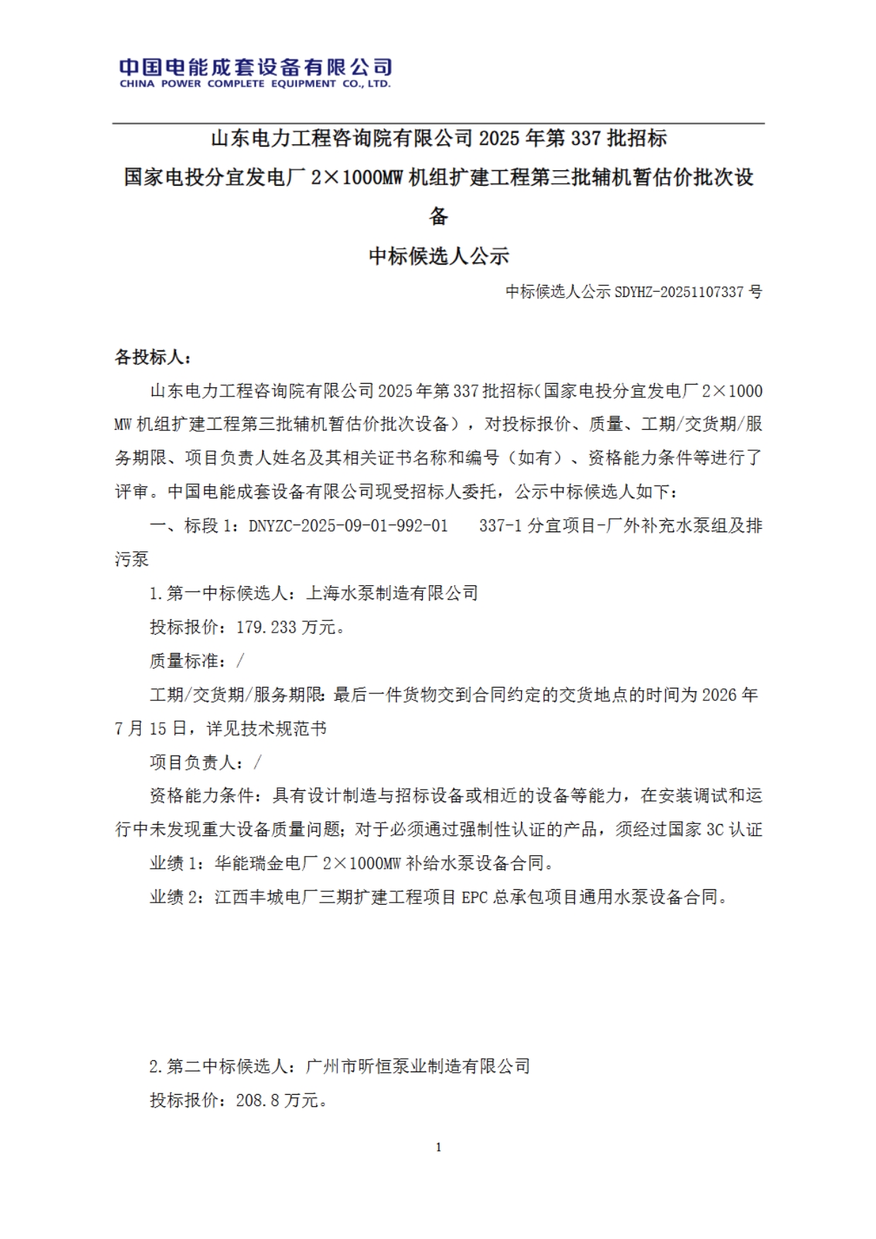 近日,国家电投发布分宜发电厂2×1000MW机组扩建工程第三批辅机暂估价批次设备中标候选人公示。山东电力工程咨询院有限公司 2025年第 337批招标(国家电投分宜发电厂 2×1000MW机组扩建工程第三批辅机暂估价批次设备),对投标报价、质量、工期/交货期/服务期限、项目负责人姓名及其相关证书名称和编号(如有)、资格能力条件等进行了评审。中国电能成套设备有限公司现受招标人委托,公示中标候选人如下: