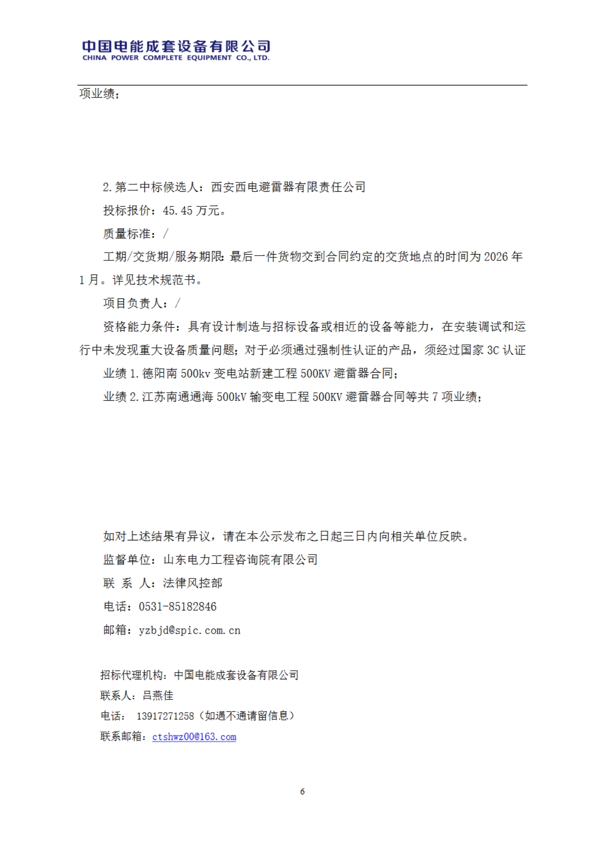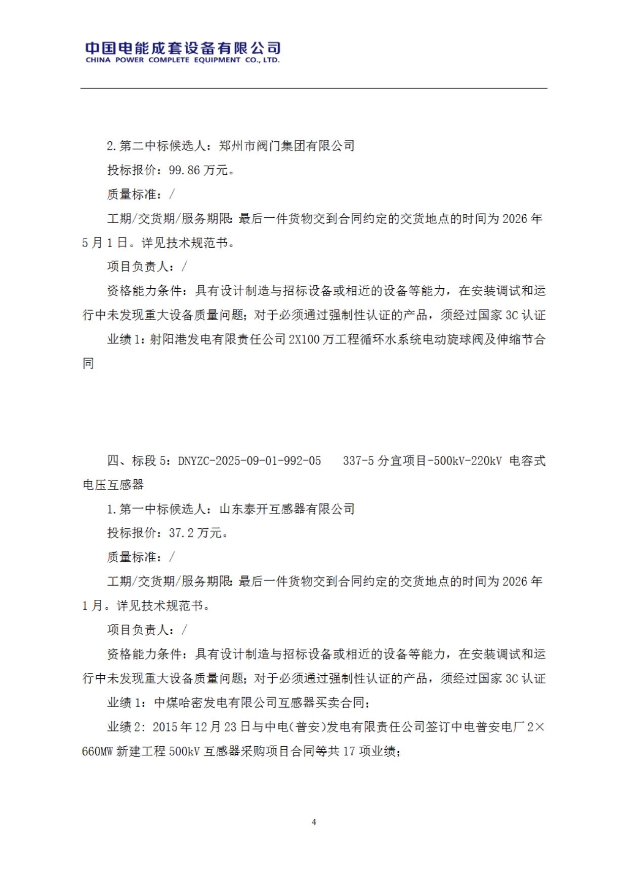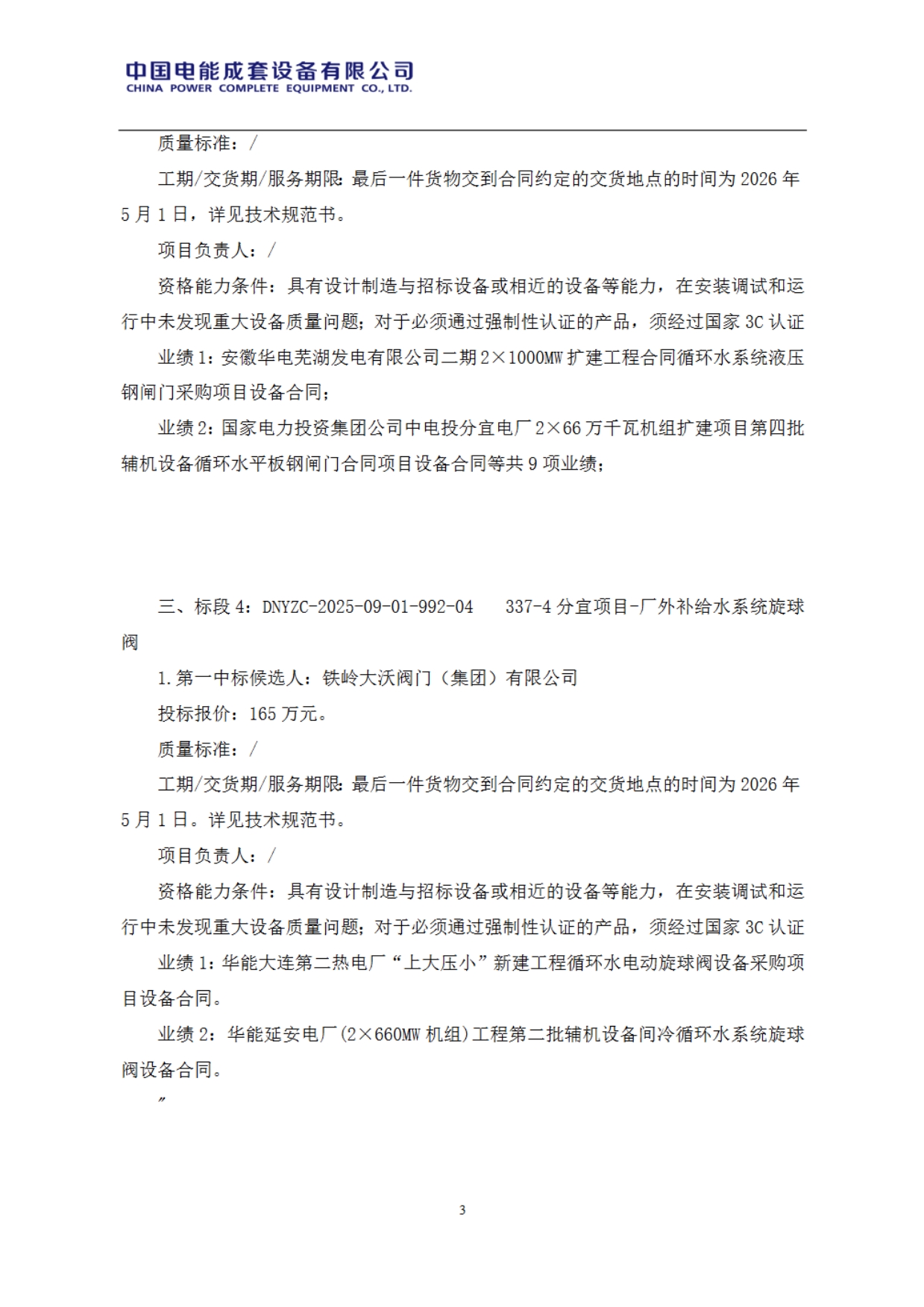 近日,国家电投发布分宜发电厂2×1000MW机组扩建工程第三批辅机暂估价批次设备中标候选人公示。山东电力工程咨询院有限公司 2025年第 337批招标(国家电投分宜发电厂 2×1000MW机组扩建工程第三批辅机暂估价批次设备),对投标报价、质量、工期/交货期/服务期限、项目负责人姓名及其相关证书名称和编号(如有)、资格能力条件等进行了评审。中国电能成套设备有限公司现受招标人委托,公示中标候选人如下: