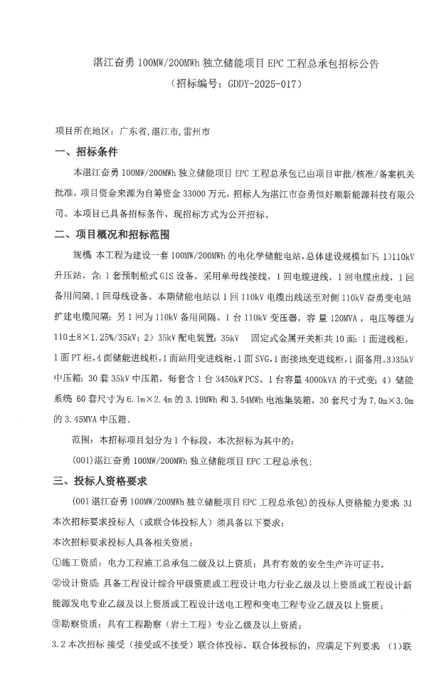 11月14日,湛江市奋勇恒好顺新能源科技有限公司发布湛江奋勇100MW/200MWh独立储能项目EPC工程总承包招标公告。项目位于广东省湛江市雷州市,建设一套100MW/200MWh的电化学储能电站。