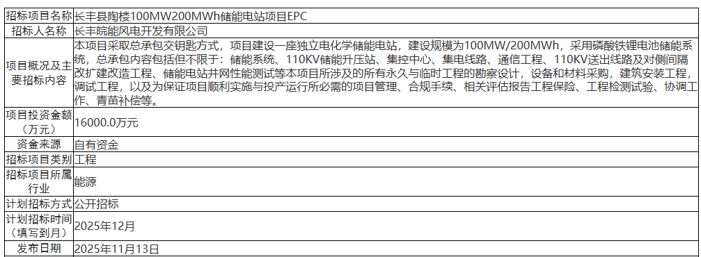 11月13日,长丰皖能风电开发有限公司发布长丰县陶楼100MW200MWh储能电站项目EPC招标预告,预计招标时间为2025年12月。项目位于安徽省合肥市长丰县,项目采取总承包交钥匙方式,建设一座独立电化学储能电站,建设规模为100MW/200MWh,采用磷酸铁锂电池储能系统,总承包内容包括但不限于:储能系统、110KV储能升压站、集控中心、集电线路、通信工程、110KV送出线路及对侧间隔改扩建改造工程、储能电站井网性能测试等本项目所涉及的所有永久与临时工程的勘察设计,设备和材料采购,建筑安装工程,调试工程,以及为保证项目顺利实施与投产运行所必需的项目管理、合规手续、相关评估报告工程保险、工程检测试验、协调工作、青苗补偿等。