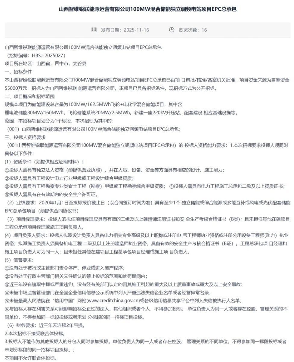 11月16日,山西智维锐联能源运营有限公司100MW混合储能独立调频电站项目EPC总承包公开招标公告发布,项目位于山西省晋中市太谷县,总投资5.5亿元,资金来源为自筹资金,招标人为山西智维锐联能源运营有限公司,招标方式为公开招标。
