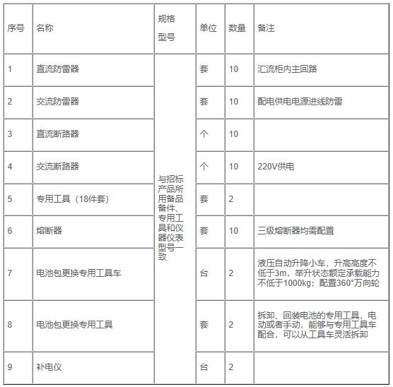 表2 备品备件、专用工具和仪器仪表清单
